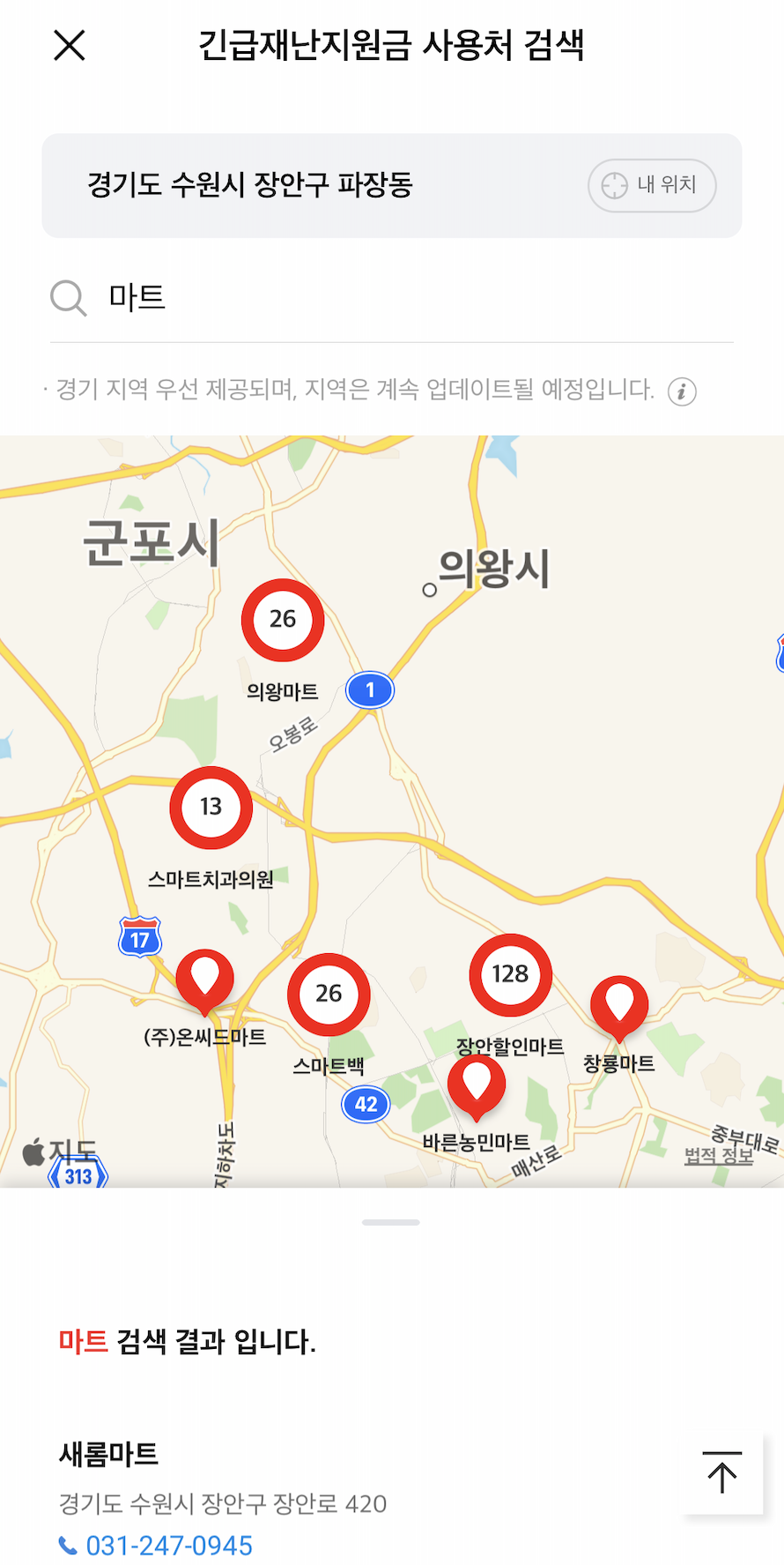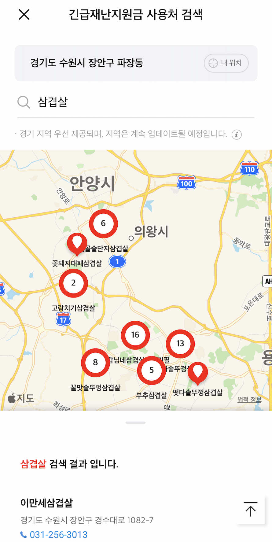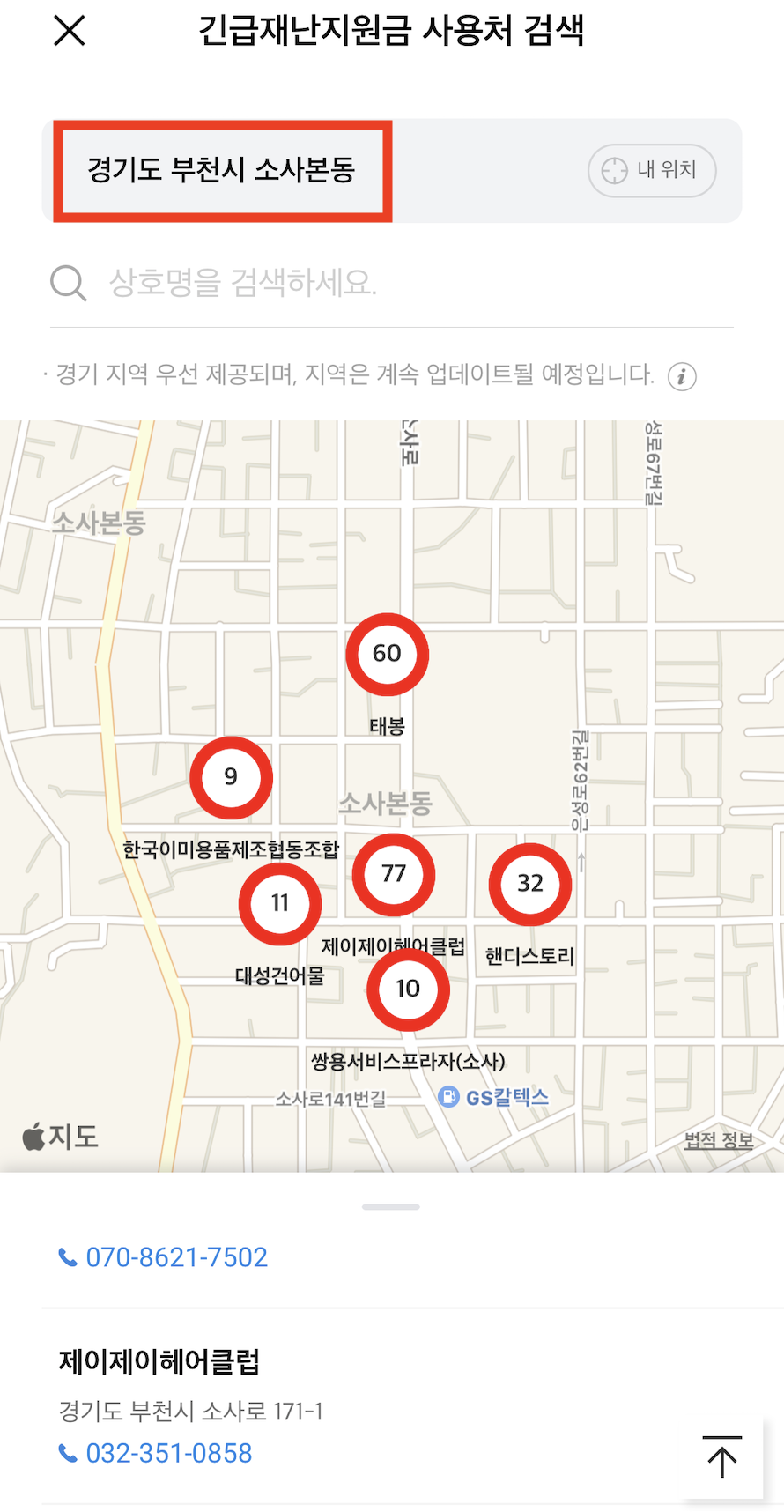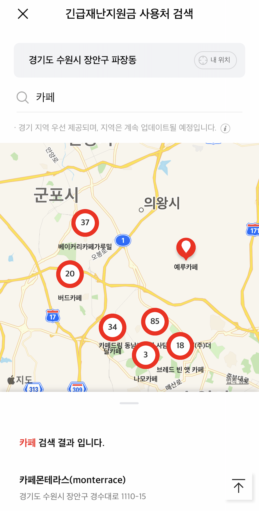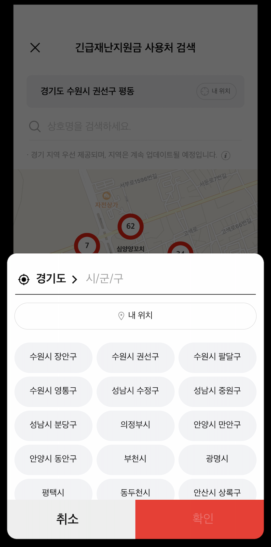 사용처에 들어가게되면 현재 위치에서 사용할 수 있는 사용처들이 검색됩니다. 주소변경 방법은 간단합니다. 주소를 클릭하신 후 {경기도 - 시 - 동} 순으로 클릭하시면 해당 지역의 사용처를 확인할 수 있습니다. [내 위치] 버튼을 이용하면 현재 위치로 다시 돌아오게 됩니다.