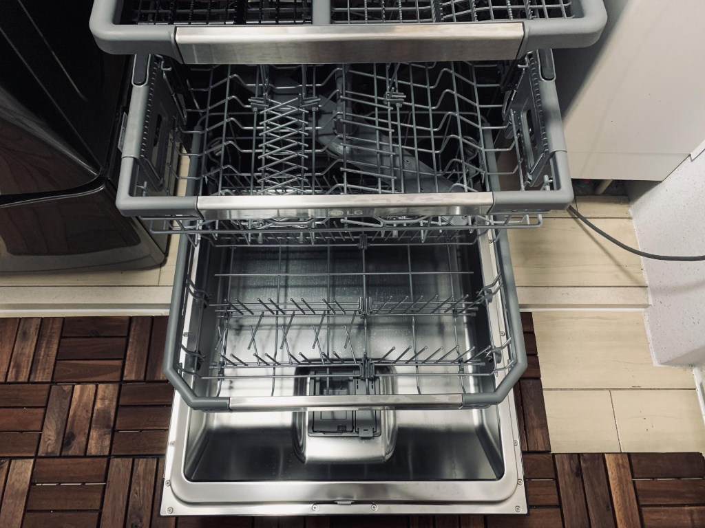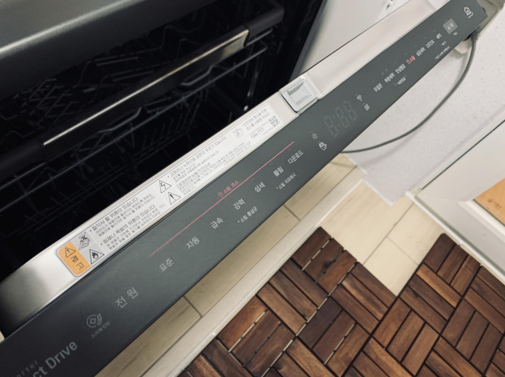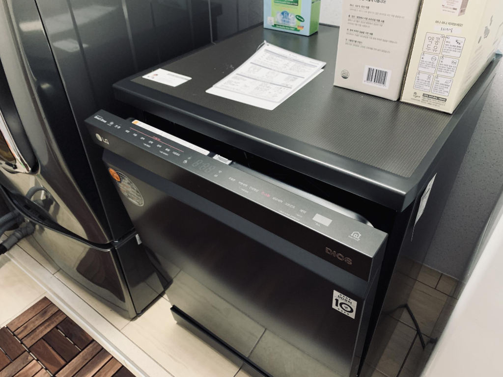 구매는 쓱닷컴에서 진행했다. 스타일러를 쓱닷컴에서 구매해 봤는데, 고장 없이 만족스럽게 사용하고 있어 별 고민 없이 결제를 진행하였다. 다른 가전들은 백화점에서 혼수로 한 번에 진행했었는데 별 차이를 느끼지 못한다. 다른 가전과 색상을 맞추기 위해 다크 그레이로 진행했다. 설치기사 님과 날짜를 잡고 바로 설치를 완료했다. 식기세척기 용 새롭게 장만한 베란다 발판도 보인다.