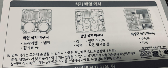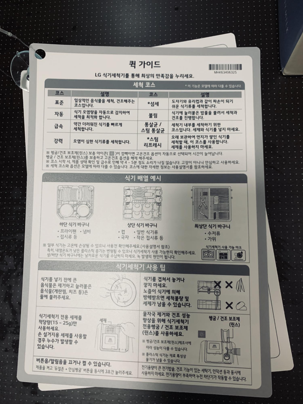 설치를 해주실 때 내용을 꼼꼼히 설명해 주시지만, 한 번에 너무 많이 배우면 기억하기가 어렵다. 다행히 퀵 가이드로 복습해 볼 수 있다. 처음이라 세척 코스와 식기 배열을 가장 많이 보게 된다.