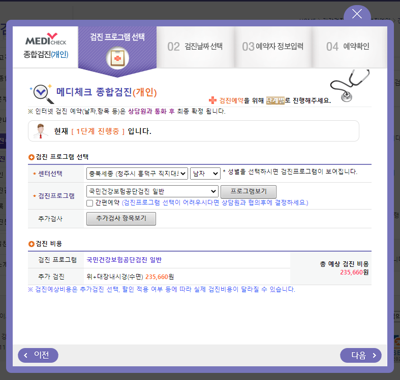 검진프로그램 종류를 선택할 수 있습니다. 추가검사 항목보기를 클릭하시면 원하는 항목을 추가하실 수 있습니다. 위+대장내시경(수면)을 추가하시면 예상 검진 비용이 나타납니다. 235,660원이 나오네요. 해당 금액은 예상비용이며, 검사 시 비용이 추가 및 할인될 수 있습니다.