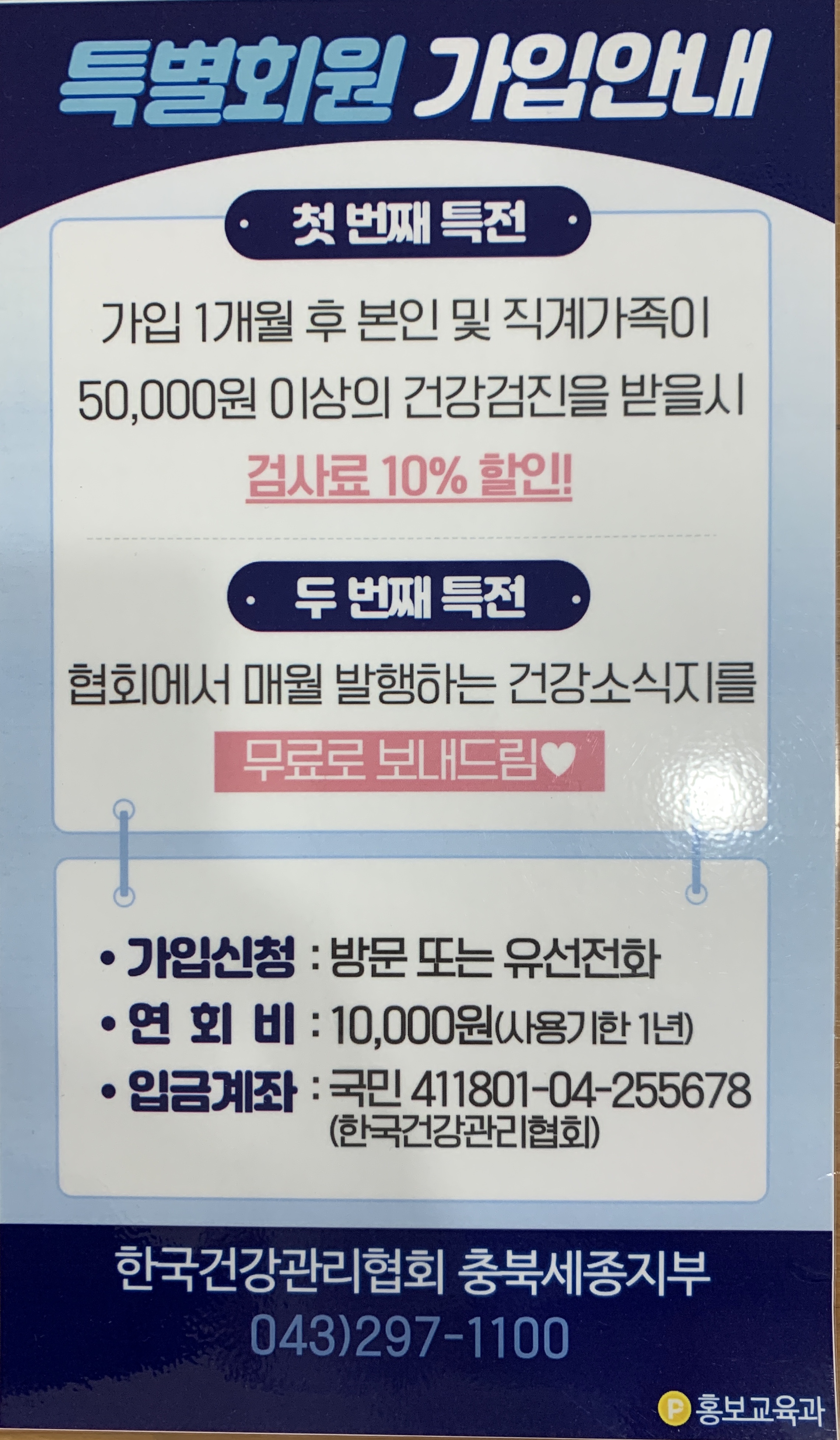 특별회원으로 가입하는 건데요. 연회원 1만원을 지불하고 특별회원에 가입하시면 1개월 후 본인 및 직계가족이 5만원 이상 건강검진을 받으시면 검사료 10%가 할인된다고 하니 굉장히 좋은 혜택입니다. 저는 검진을 받기 전에는 해당 정보를 몰라서 다음 검진부터 진행해 볼 생각입니다.