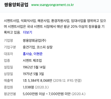 ▼ 쌍용양회는 시멘트 및 해운, 환경자원 사업을 하고 있는 중견기업으로 매출액 1조 5천억 원에 종업원 1,000명이 넘는 기업입니다.
