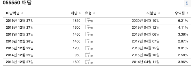신한지주 배당금 지불일은 4개월 뒤인 4월 중순전으로 예상됩니다. 2019년도 배당금은 주당 1850원입니다. 이는 수익률로 6.21%에 해당하는 금액이네요. 지금까지는 계속 오르는 배당성향을 보아왔는데, 과연 2020년도는 그 배당금 수익률이 어떨지 궁금해지네요.
