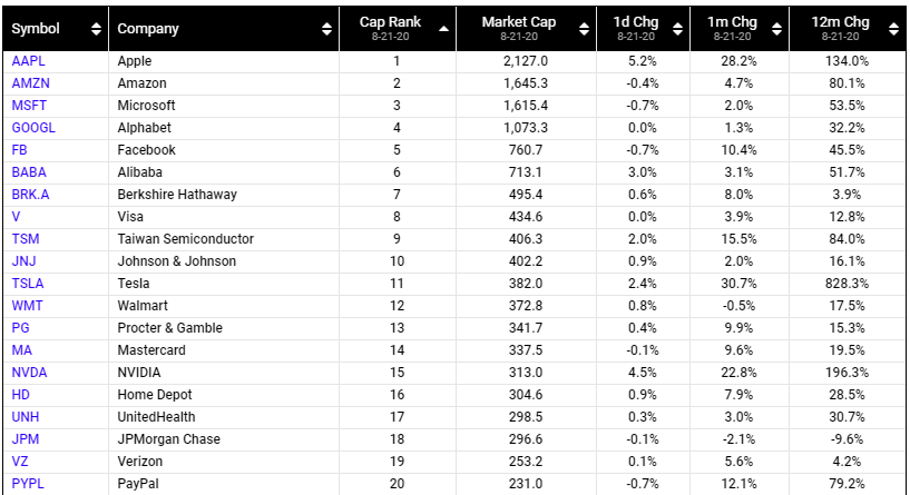 An always up-to-date table of the largest companies by market cap available on any major US stock exchange.