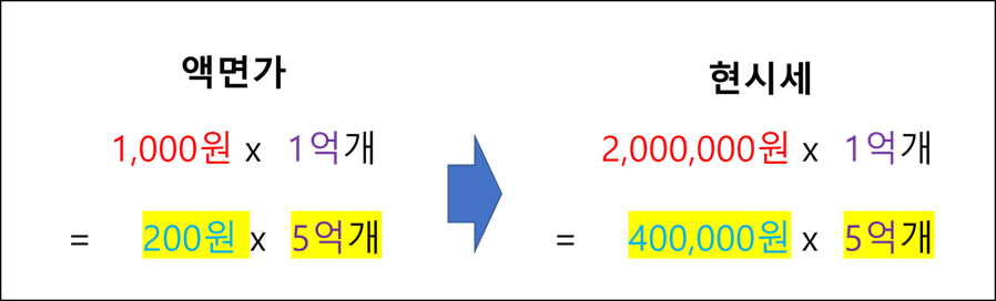 액면가 1,000원에 주식수 1억개으로 시작한 A기업의 주가가 2,000,000원으로 올랐다고 가정합시다. 이때 액면가를 200원으로 떨어뜨리게 되면 주식수는 5억개가 되고, 이 5억개에 맞춰 현재 시세도 변경되게 되는 것이죠.
